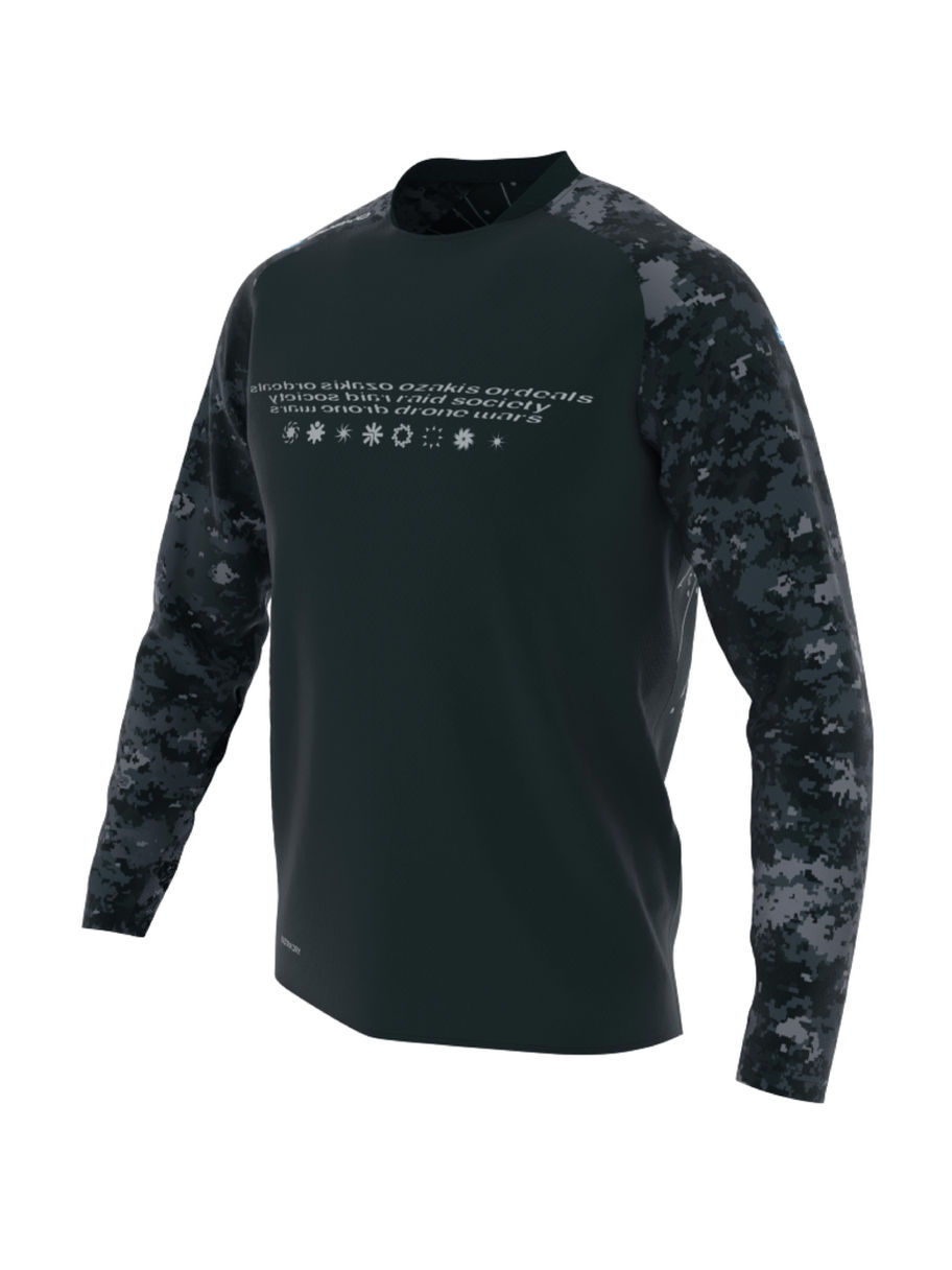 The A08 pattern references biogenic systems, directional force, and swarm dynamics translated into a functional field jersey. The black variant keeps the profile low and compact while maintaining full performance characteristics.